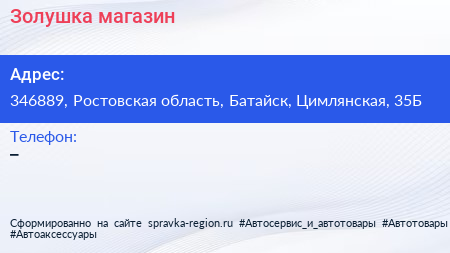 Золушка, магазин по адресу 346889, Ростовская область, Батайск, Цимлянская, 35Б в дальнейшем Организация, размещена в следующих категориях: