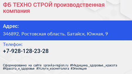 ФБ ТЕХНО СТРОЙ, производственная компания по адресу 346892, Ростовская область, Батайск, Южная, 9 в дальнейшем Организация, размещена в следующих категориях: