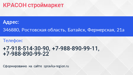 КРАСОН, строймаркет по адресу 346880, Ростовская область, Батайск, Фермерская, 21а в дальнейшем Организация, размещена в следующих категориях: