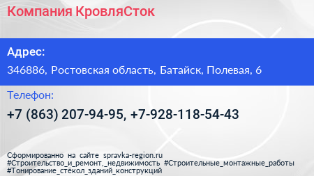 Компания КровляСток по адресу 346886, Ростовская область, Батайск, Полевая, 6 в дальнейшем Организация, размещена в следующих категориях: