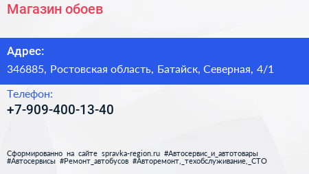Магазин обоев по адресу 346885, Ростовская область, Батайск, Северная, 4/1 в дальнейшем Организация, размещена в следующих категориях: