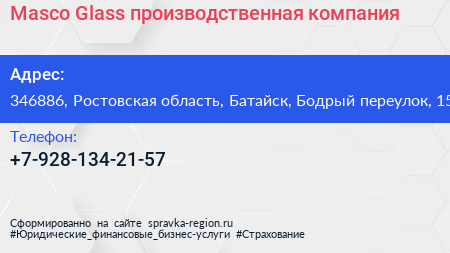 Masco Glass, производственная компания по адресу 346886, Ростовская область, Батайск, Бодрый переулок, 15 в дальнейшем Организация, размещена в следующих категориях: