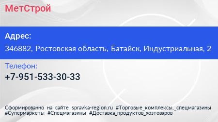 МетСтрой по адресу 346882, Ростовская область, Батайск, Индустриальная, 2 в дальнейшем Организация, размещена в следующих категориях: