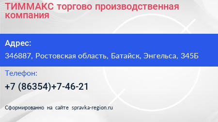 ТИММАКС, торгово-производственная компания по адресу 346887, Ростовская область, Батайск, Энгельса, 345Б в дальнейшем Организация, размещена в следующих категориях: