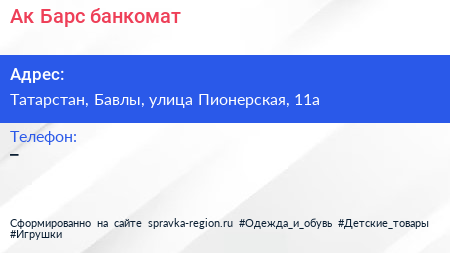 Ак Барс, банкомат по адресу Татарстан, Бавлы, улица Пионерская, 11а в дальнейшем Организация, размещена в следующих категориях: