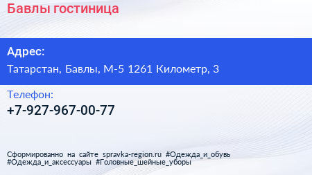 Бавлы, гостиница по адресу Татарстан, Бавлы, М-5 1261 Километр, 3 в дальнейшем Организация, размещена в следующих категориях: