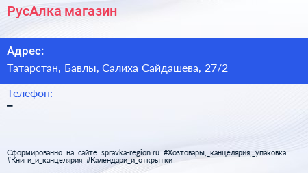 РусАлка, магазин по адресу Татарстан, Бавлы, Салиха Сайдашева, 27/2 в дальнейшем Организация, размещена в следующих категориях: