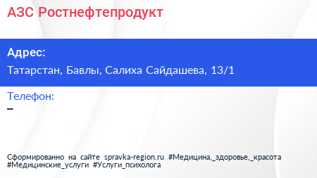 АЗС, Ростнефтепродукт по адресу Татарстан, Бавлы, Салиха Сайдашева, 13/1 в дальнейшем Организация, размещена в следующих категориях: