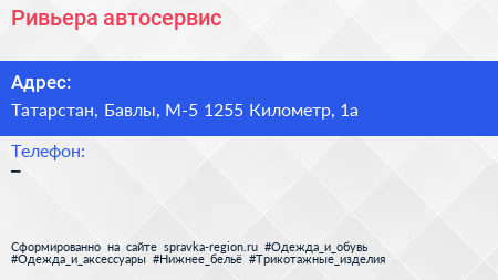 Ривьера, автосервис по адресу Татарстан, Бавлы, М-5 1255 Километр, 1а в дальнейшем Организация, размещена в следующих категориях: