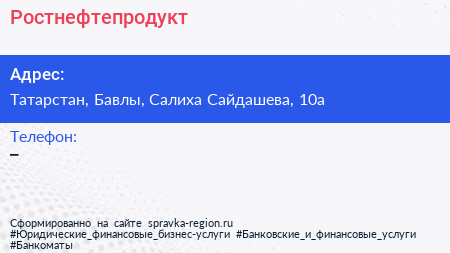 Ростнефтепродукт по адресу Татарстан, Бавлы, Салиха Сайдашева, 10а в дальнейшем Организация, размещена в следующих категориях: