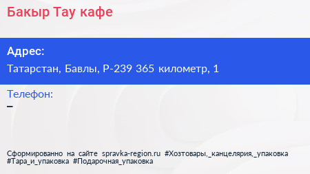 Бакыр Тау, кафе по адресу Татарстан, Бавлы, Р-239 365 километр, 1 в дальнейшем Организация, размещена в следующих категориях: