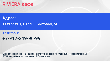 RIVIERA, кафе по адресу Татарстан, Бавлы, Бытовая, 5Б в дальнейшем Организация, размещена в следующих категориях: