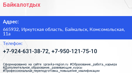 Байкалотдых по адресу 665932, Иркутская область, Байкальск, Комсомольская, 11а в дальнейшем Организация, размещена в следующих категориях:
