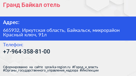 Гранд Байкал, отель по адресу 665932, Иркутская область, Байкальск, микрорайон Красный ключ, 91л в дальнейшем Организация, размещена в следующих категориях: