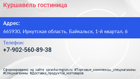 Куршавель, гостиница по адресу 665930, Иркутская область, Байкальск, 1-й квартал, 6 в дальнейшем Организация, размещена в следующих категориях: