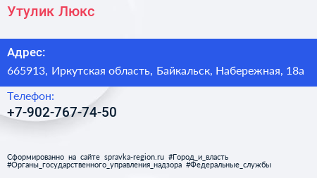 Утулик Люкс по адресу 665913, Иркутская область, Байкальск, Набережная, 18а в дальнейшем Организация, размещена в следующих категориях: