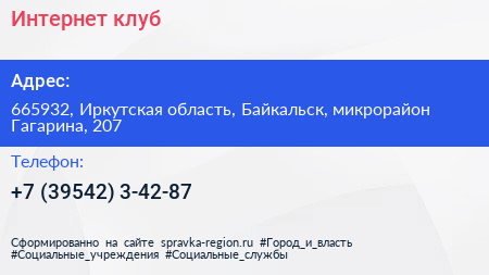 Интернет-клуб по адресу 665932, Иркутская область, Байкальск, микрорайон Гагарина, 207 в дальнейшем Организация, размещена в следующих категориях: