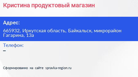 Кристина, продуктовый магазин по адресу 665932, Иркутская область, Байкальск, микрорайон Гагарина, 13а в дальнейшем Организация, размещена в следующих категориях: