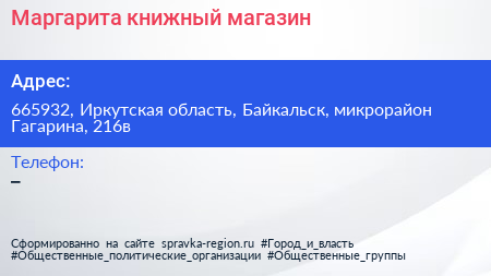 Маргарита, книжный магазин по адресу 665932, Иркутская область, Байкальск, микрорайон Гагарина, 216в в дальнейшем Организация, размещена в следующих категориях: