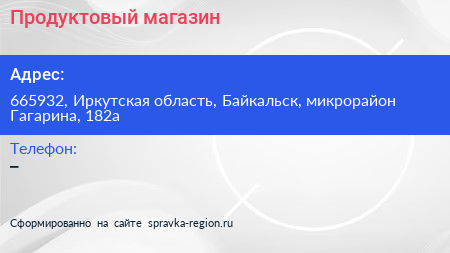 Продуктовый магазин по адресу 665932, Иркутская область, Байкальск, микрорайон Гагарина, 182а в дальнейшем Организация, размещена в следующих категориях: