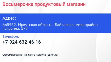 Восьмерочка, продуктовый магазин по адресу 665932, Иркутская область, Байкальск, микрорайон Гагарина, 179 в дальнейшем Организация, размещена в следующих категориях: