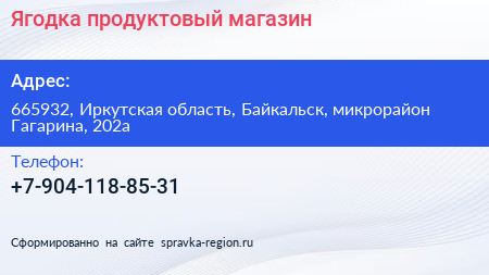 Ягодка, продуктовый магазин по адресу 665932, Иркутская область, Байкальск, микрорайон Гагарина, 202а в дальнейшем Организация, размещена в следующих категориях: