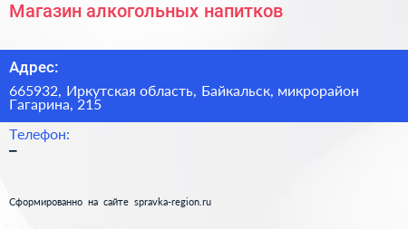 Магазин алкогольных напитков по адресу 665932, Иркутская область, Байкальск, микрорайон Гагарина, 215 в дальнейшем Организация, размещена в следующих категориях: