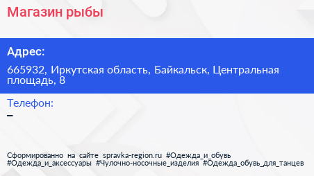 Магазин рыбы по адресу 665932, Иркутская область, Байкальск, Центральная площадь, 8 в дальнейшем Организация, размещена в следующих категориях: