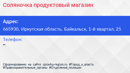 Соляночка, продуктовый магазин по адресу 665930, Иркутская область, Байкальск, 1-й квартал, 25 в дальнейшем Организация, размещена в следующих категориях: