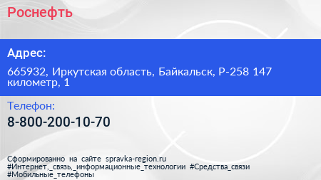 Роснефть по адресу 665932, Иркутская область, Байкальск, Р-258 147 километр, 1 в дальнейшем Организация, размещена в следующих категориях: