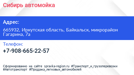 Сибирь, автомойка по адресу 665932, Иркутская область, Байкальск, микрорайон Гагарина, 7а в дальнейшем Организация, размещена в следующих категориях: