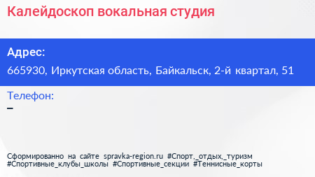 Калейдоскоп, вокальная студия по адресу 665930, Иркутская область, Байкальск, 2-й квартал, 51 в дальнейшем Организация, размещена в следующих категориях: