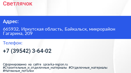 Светлячок по адресу 665932, Иркутская область, Байкальск, микрорайон Гагарина, 209 в дальнейшем Организация, размещена в следующих категориях: