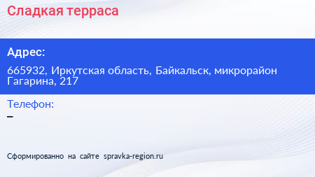 Сладкая терраса по адресу 665932, Иркутская область, Байкальск, микрорайон Гагарина, 217 в дальнейшем Организация, размещена в следующих категориях:
