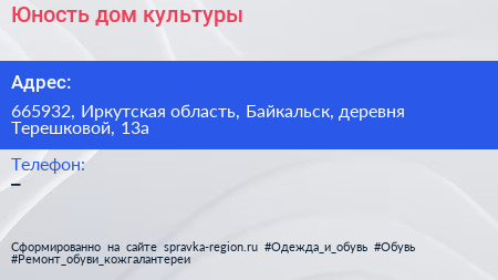 Юность, дом культуры по адресу 665932, Иркутская область, Байкальск, деревня Терешковой, 13а в дальнейшем Организация, размещена в следующих категориях:
