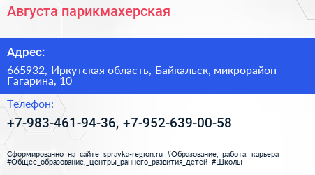Августа, парикмахерская по адресу 665932, Иркутская область, Байкальск, микрорайон Гагарина, 10 в дальнейшем Организация, размещена в следующих категориях: