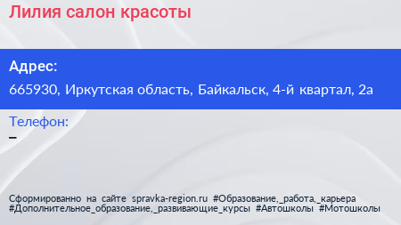Лилия, салон красоты по адресу 665930, Иркутская область, Байкальск, 4-й квартал, 2а в дальнейшем Организация, размещена в следующих категориях: