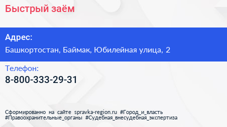 Быстрый заём по адресу Башкортостан, Баймак, Юбилейная улица, 2 в дальнейшем Организация, размещена в следующих категориях: