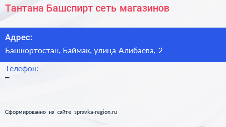 Тантана-Башспирт, сеть магазинов по адресу Башкортостан, Баймак, улица Алибаева, 2 в дальнейшем Организация, размещена в следующих категориях: