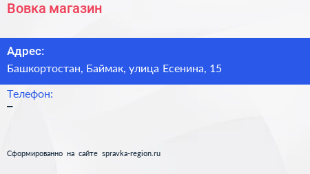 Вовка, магазин по адресу Башкортостан, Баймак, улица Есенина, 15 в дальнейшем Организация, размещена в следующих категориях: