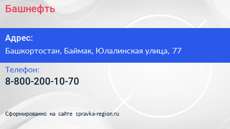 Башнефть по адресу Башкортостан, Баймак, Юлалинская улица, 77 в дальнейшем Организация, размещена в следующих категориях: