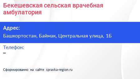 Бекешевская сельская врачебная амбулатория по адресу Башкортостан, Баймак, Центральная улица, 1Б в дальнейшем Организация, размещена в следующих категориях: