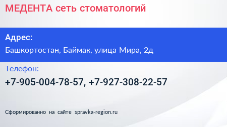 МЕДЕНТА, сеть стоматологий по адресу Башкортостан, Баймак, улица Мира, 2д в дальнейшем Организация, размещена в следующих категориях: