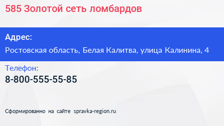 585*Золотой, сеть ломбардов по адресу Ростовская область, Белая Калитва, улица Калинина, 4 в дальнейшем Организация, размещена в следующих категориях: