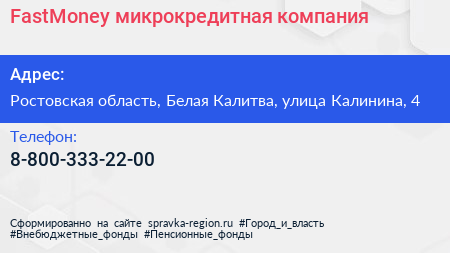 FastMoney, микрокредитная компания по адресу Ростовская область, Белая Калитва, улица Калинина, 4 в дальнейшем Организация, размещена в следующих категориях: