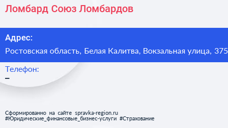 Ломбард Союз Ломбардов по адресу Ростовская область, Белая Калитва, Вокзальная улица, 375 в дальнейшем Организация, размещена в следующих категориях: