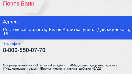 Почта Банк по адресу Ростовская область, Белая Калитва, улица Дзержинского, 15 в дальнейшем Организация, размещена в следующих категориях: