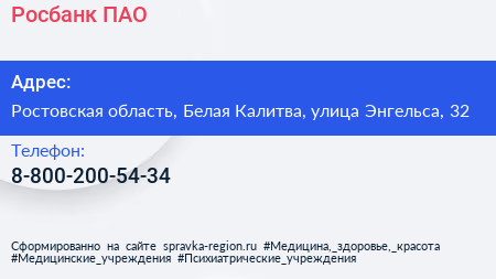 Росбанк, ПАО по адресу Ростовская область, Белая Калитва, улица Энгельса, 32 в дальнейшем Организация, размещена в следующих категориях: