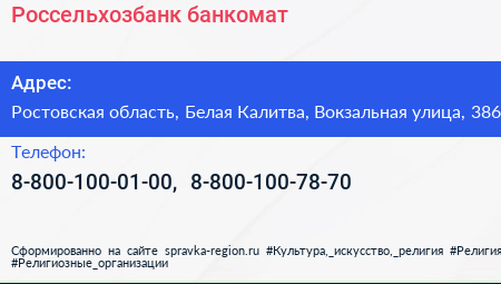 Россельхозбанк, банкомат по адресу Ростовская область, Белая Калитва, Вокзальная улица, 386 в дальнейшем Организация, размещена в следующих категориях: