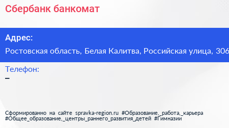Сбербанк, банкомат по адресу Ростовская область, Белая Калитва, Российская улица, 306 в дальнейшем Организация, размещена в следующих категориях: